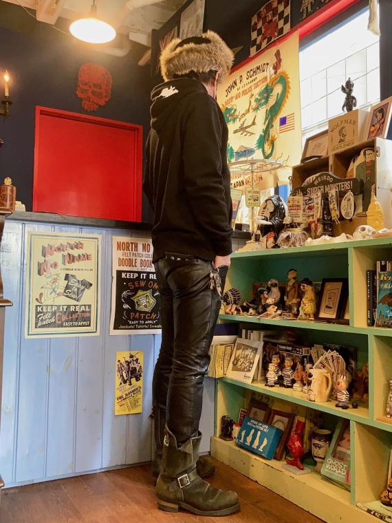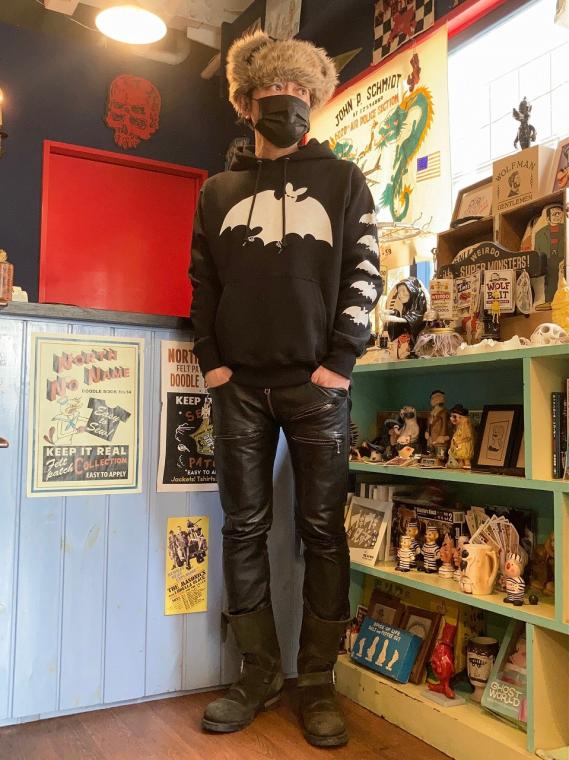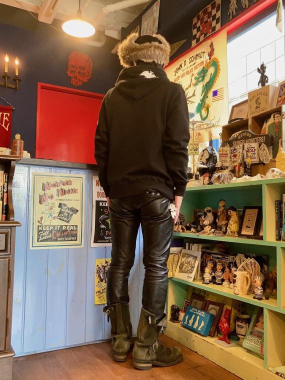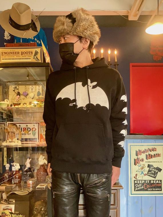 フロント・左袖・フードに、ヴィンテージ レコードのジャケットのイラストをモチーフにしたコウモリのプリントが、シルクスクリーンプリントで施されております。