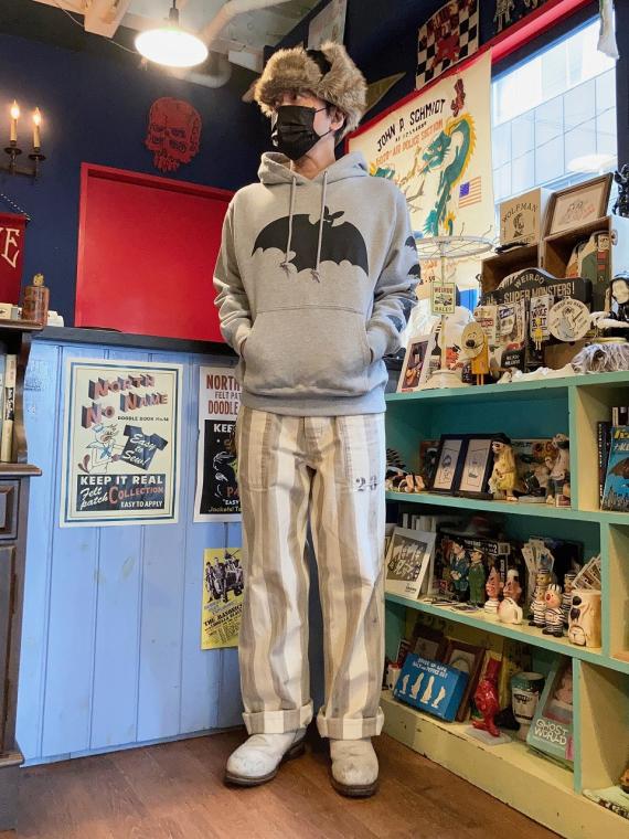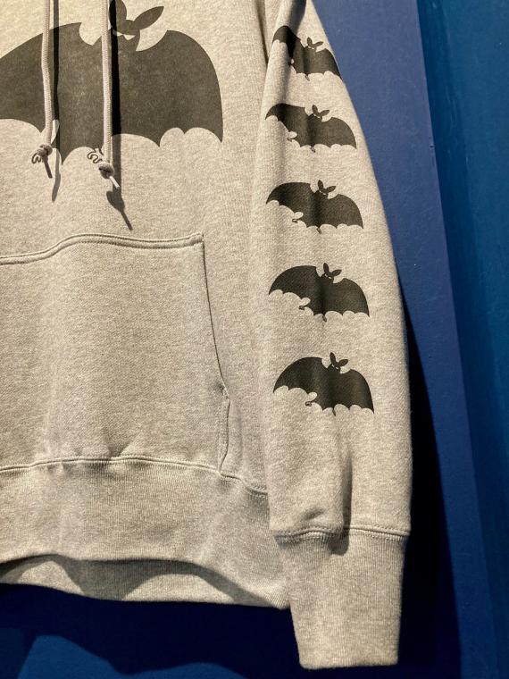 フロント・左袖・フードに、ヴィンテージ レコードのジャケットのイラストをモチーフにしたコウモリのプリントが、シルクスクリーンプリントで施されております。