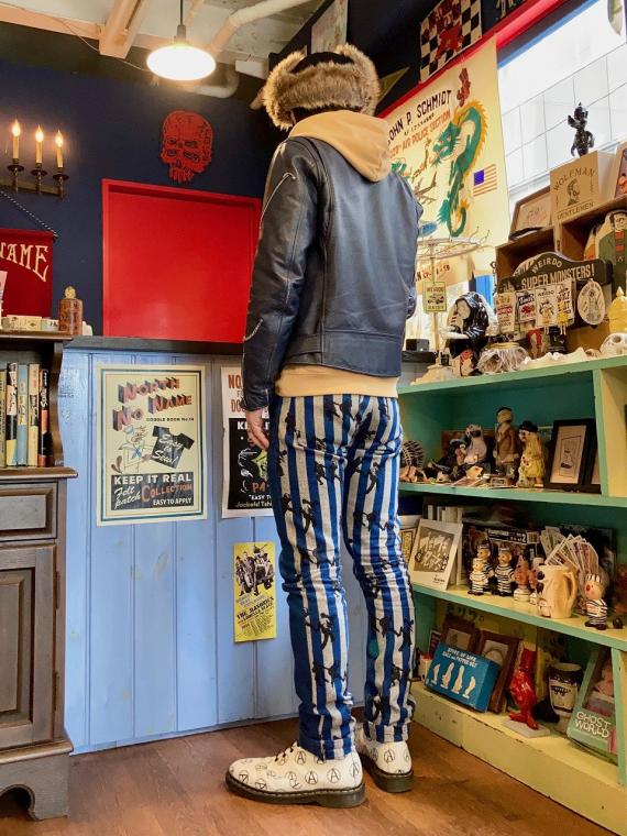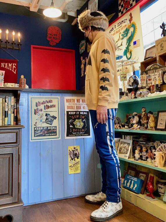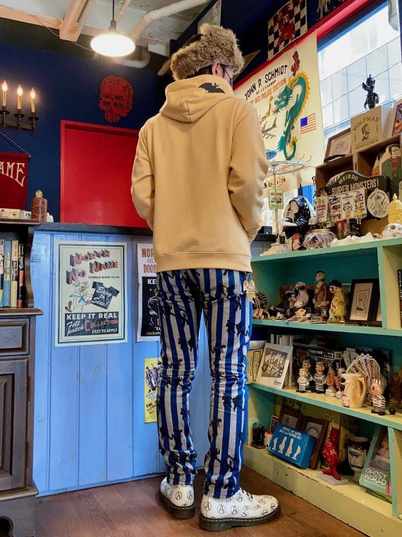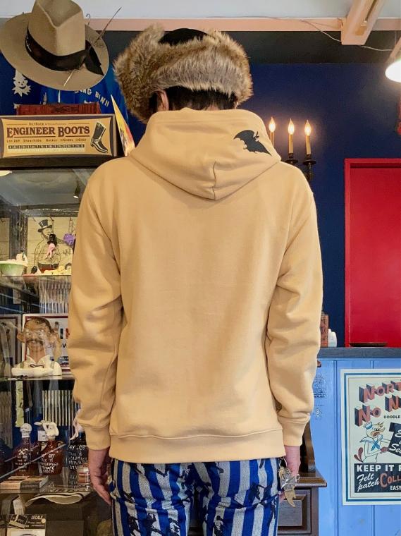 フロント・左袖・フードに、ヴィンテージ レコードのジャケットのイラストをモチーフにしたコウモリのプリントが、シルクスクリーンプリントで施されております。