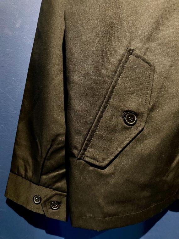 表地は、ポリエステルの耐久性と綿の快適性を兼ね備えた型崩れの少ない、マットな質感のT/Cウェザー。立ち襟のリブ使いにより厚みが増した美しいシルエットです。リブは毛玉ができにくく、肌ざわりも滑らか。袖口に備えたカフスボタン2つによる調節が可能で、もたつきを防ぎます。